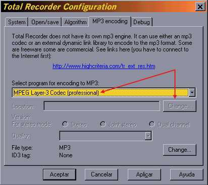 En la nueva versión 3.0 de Total Recorder podemos escoger también el formato en el cual queremos que se grabe el fichero de audio. Si tienes una máquina potente (de P3-500 hacia arriba) podrás hacerlo directamente en MP3 con el codec de Radium (para usar otros codecs freeware como BladeEnc o LameEnc será necesaria una máquina más potente y son unos codecs tan lentos que es mejor grabar en WAV y convertirlo después con MP3Compressor). Para ello, marca la casilla "Convert using parameters specified below" y selecciona en el menú "Recording parameters" el codec a 48.000 Hz/128 Kbs/s stereo. Asegúrate también de seleccionar el codec en el siguiente menu: